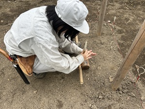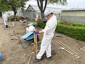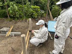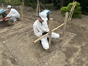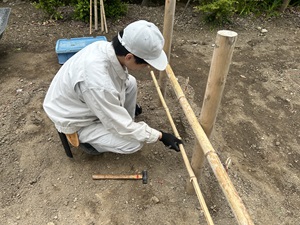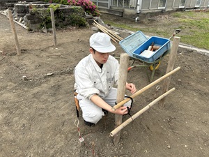 公開日 2026年04月27日 令和8年4月23日㈭ 科目「造園施工管理」にて環境科学科3年緑化系列の生徒が造園技能士検定の技術習得のために庭の施工を行いました。 今日は前回の授業で据え付けた柱から竹垣を制作しました。竹をまっすぐに見せるコツや節止めの向き、水平さなど様々な事に注意しながら作業を行いました。 竹の結束では、友達と教え合いながら作業を進めている様子も見え、2年時の学習が身についていました。