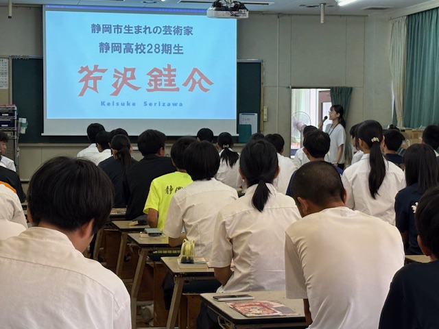 公開日 2025年09月06日 9月3日、1年生の芸術選択科目「工芸Ⅰ」の授業で、芹沢銈介美術館スタッフにょる「出前講座」を実施していただきました。 今年生誕130週年となる芹沢銈介氏は本校(旧制中学)の卒業生です。素晴らしい作品を次々と発表し、人間国宝となりました。染色家としてだけでなく世界各国の民芸品・工芸品をコレクションされていました。 この時間に得られた知識や図案のすばらしさを、これから取り組む型染ランチョンマット制作に活かしてもらえたら嬉しいです。