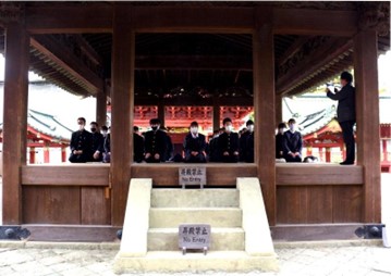能の創始者である観阿弥が今川氏に呼ばれ、最後の舞をこの舞殿に奉納したということから「静岡浅間神社舞殿での観阿弥の見た世界を体験する」を題材として、音楽Ⅰでは能「羽衣キリ」を事前に学習して浅間神社を訪問し、全員で舞殿に登壇して謡い、神様に奉納します。今年で9年目になります。