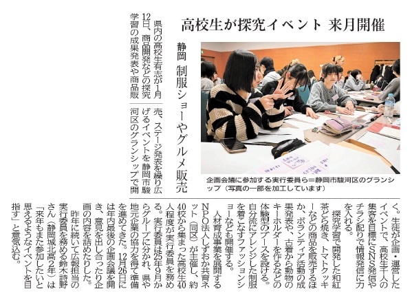公開日 2026年01月08日 本校生徒は、1月12日(月)開催予定の高校生主体「探究イベント」に実行委員・出展者として参加します。探究で培った成果を、制服ファッションショーや地域グルメ販売、プレゼン・体験型ワークショップで発信。地域事業者や大学と連携し、静岡の魅力発信と課題解決のアイデアを提案します。多くの皆さまのご来場・応援をお待ちしています。