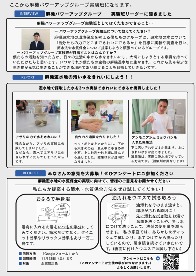「麻機パワーアップグループ」が作成した『麻機パワーアップ便り』をお届けします。ご一読いただき、最後にあるQRコードからアンケートに答えていただけると生徒の学びにつながります。是非、よろしくお願いします。