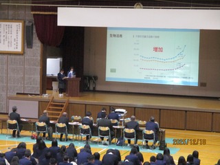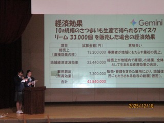 公開日 2025年12月19日 12月18日(木)農業クラブプロジェクト発表校内大会が体育館で行われました。 各学科の代表グループが日頃の研究活動の成果を発表しました。選考の結果選ばれたグループは来月行われる県大会へ出場します。