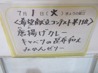 公開日 2025年07月01日 7月1日(火)給食の献立は、令和6年度の希望献立コンテストで第1位に輝いた『唐揚げカレー』です。みんな大好きな唐揚げ&カレーを笑顔で食べていました。栄養士さんもとっても嬉しそうでした! 「今日も最幸の給食タイムでした!ごちそうさまでした。」☆彡 東部特支