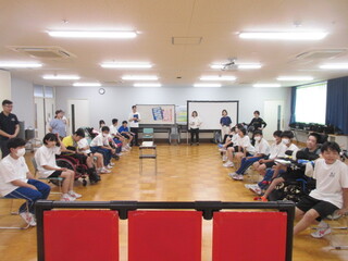 7月8日(火)、中学部の3年生が長井崎小中一貫学校の7年生と交流会を行いました。最初は両校とも緊張した面持ちでしたが、学校紹介で本校のことを少し理解して貰い、長井崎小中一貫学校からの合唱発表、自己紹介が終わるとすっかり打ち解け笑顔が見られました。本日のメインイベントのねらってあてよう(59ズバーン)では、笑い声も溢れていました。とっても素敵な交流会でした!!!