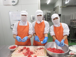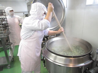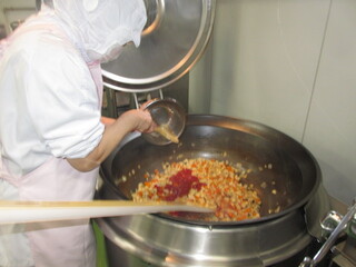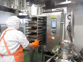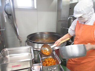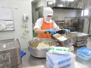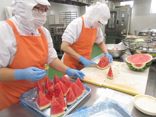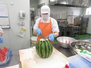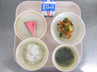 7月18日(金)、1学期の給食も今日を含めてあと4回です。日ごろからお世話になっている調理員さんの仕事ぶりを紹介します。今日の献立は、ご飯・肉団子と彩り野菜の甘酢炒め・あさりとわかめスープ・すいか・牛乳でした。