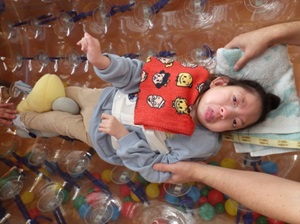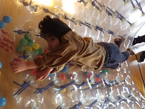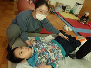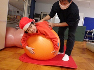 バランスボールにうつ伏せになったり、エアーマットにあおむけになったりしていろいろな揺れを楽しみました!