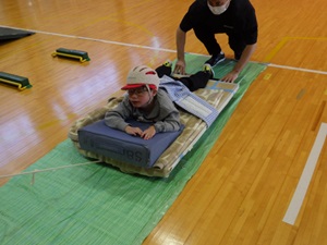 4年生は、体育の「サーキットをしよう!」で滑る、揺れる、回転するなどの学習をしました。サイバーホイール・エアーマット・バランスボール・傾斜マット、キャスターカーなどを利用して、滑ったり、揺れたり、回転したりする感覚などを体験しました!
