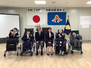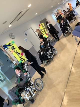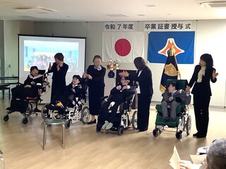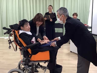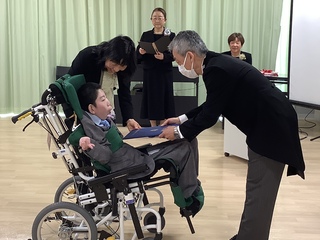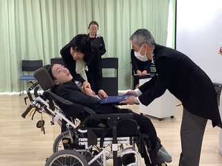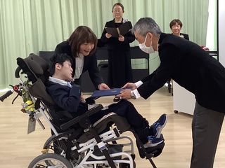 3月9日(月)、静岡医療センターさくら病棟で中学部・高等部の訪問教育3年生の卒業式が行われました。校長先生から一人ひとりに卒業証書を手渡した後、これまでの学習を振り返り「一人一人が笑顔や声・体の動きで気持ちを表現して、主体的に学習に参加したことや東翔祭では本校の生徒と力を合わせて一つの作品を完成させ、割れんばかりの声援と拍手が送られました。これから始まる次のステージが喜びに溢れ、元気にたくましく豊かに輝くことを願っています。」とエールを贈りました。
