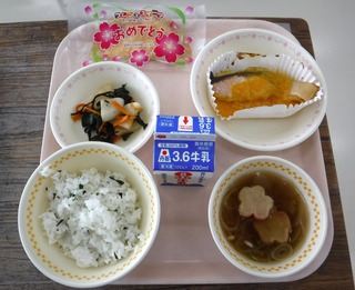公開日 2026年04月21日 今日の献立4/21 今日は「入学・進級お祝い献立」です わかめご飯 鮭の黄金焼き かぶの塩昆布和え 花麩のすまし汁 お祝いクレープ 牛乳 黄金焼きのように光り輝く一年に!