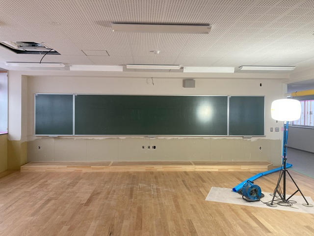 公開日 2025年07月14日 1階 〈教室〉教壇設置・黒板設置・フローリング床貼りを行いました。 2階 〈職員室〉床OAフロア施工を行いました。 3階 〈教室〉内壁塗装を行いました。 4階 〈トイレ〉天井・壁部分に軽量鉄骨の取付を行いました。