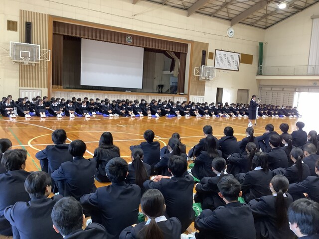 対面式では全校生徒が初めて一堂に会し、生徒会長から一年生に歓迎の言葉が送られました。